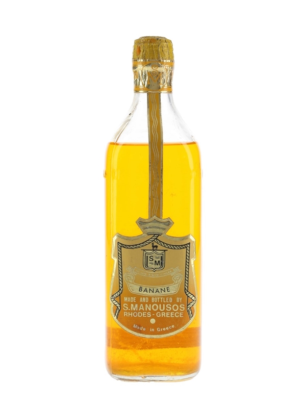 A bottle of Banane liqueur produced and bottled in Rhodes, Greece, by S. Manousos. We estimate this was bottled in the 1960s.