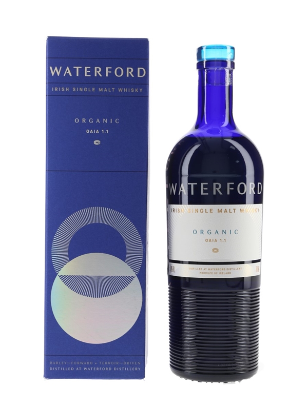 A bottle of Waterford Irish Single Malt Whisky, Organic Gaia 1.1. The barley for this whisky was grown in Garryhoe and harvested in Summer 2015. This was distilled in the 36th week of 2016, matured for 3 years 9 months 20 days and bottled in August and September 2020 at 50% ABV.