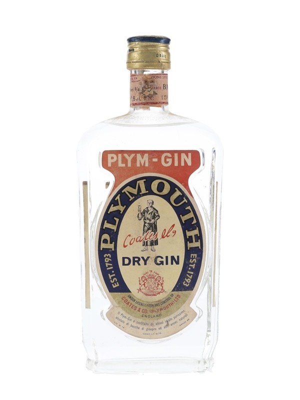 A bottle of Coates & Co. Plym Gin, a dry Plymouth gin. This was produced in Italy by Stock under licence from and control of Coates & Co. We estimate this was bottled in the 1960s.