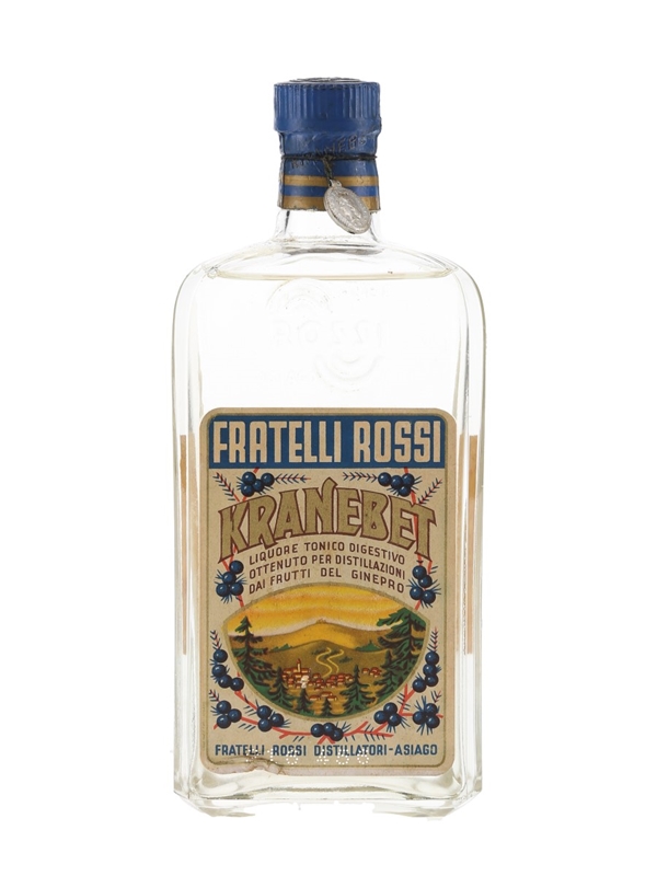 A bottle of Rossi Kranebet, a tonic liqueur made from juniper and other alpine herbs. This was produced at the highest distillery in Europe (at the time). We estimate this was bottled between 1947 and 1949.