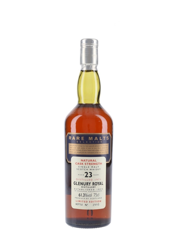 A bottle of Glenury Royal 23 Year Old Single Malt Scotch Whisky. This was distilled in 1971 and bottled for Diageo's now-discontinued Rare Malts Selection.