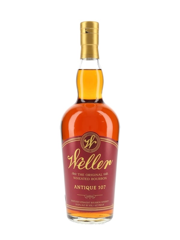 A bottle of Weller Antique 107, the Original Wheated Bourbon. This was produced at Buffalo Trace distillery, bottled at 53.5% ABV and imported to England by Hi-Spirits.