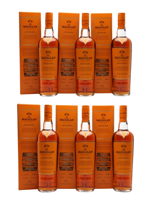 This lot contains six bottles of The Macallan Edition No.2 Highland Single Malt Scotch Whisky. This is a limited edition matured in four distinct cask types selected by master blender Bob Dalgarno and Spanish chefs Joan, Josep and Jordi Roca from El Celler de Can Roca. The restaurant was twice voted best restaurant in the world.