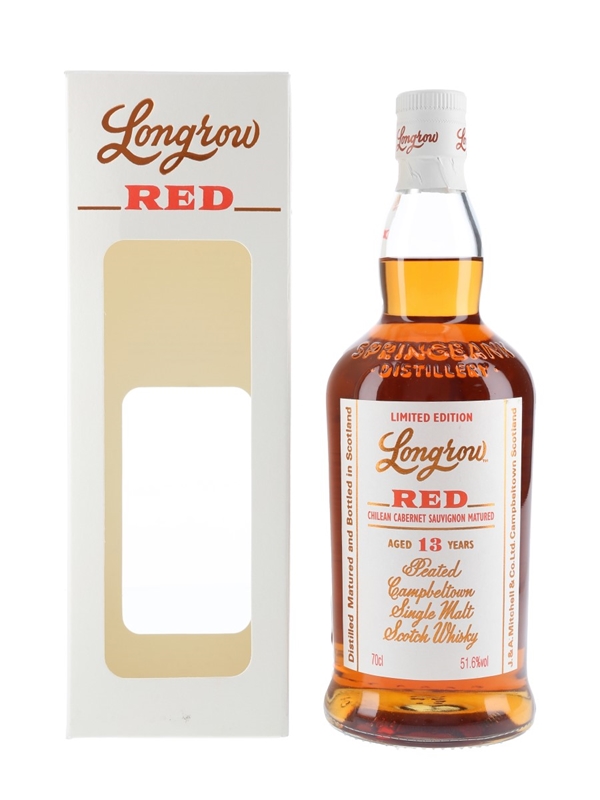 A bottle of Longrow Red 13 Year Old Limited Edition Peated Campbeltown Single Malt Scotch Whisky. This was matured for 10 years in a combination of bourbon barrels and refill sherry hogsheads, then transferred into Chilean Cabernet Sauvignon casks for a further three years. The bottling code indicates this was bottled on 20 January 2020.