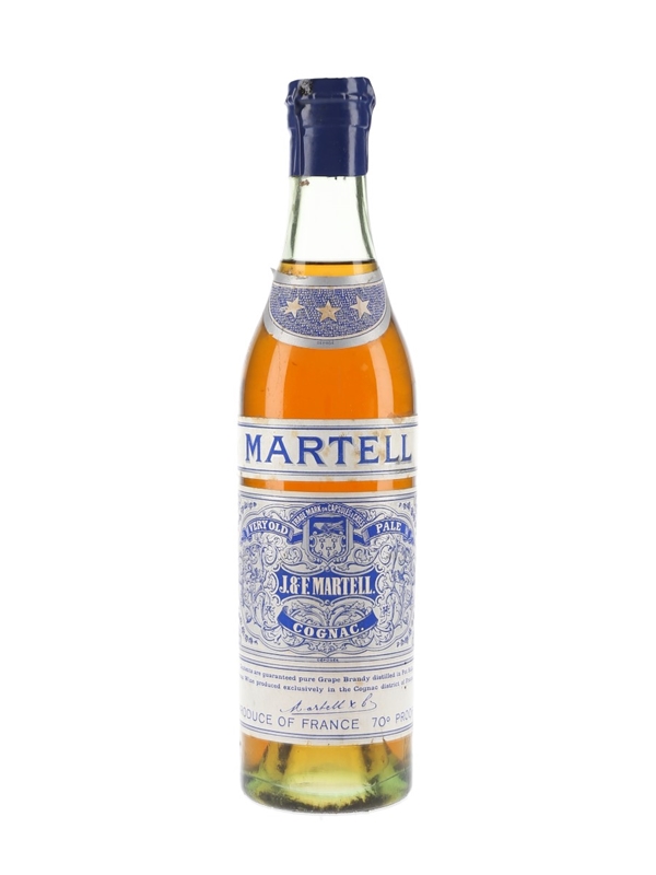 A bottle of Martell 3 Star Very Old Pale Cognac, sealed with a spring cap closure. We estimate this was bottled in the 1950s.
