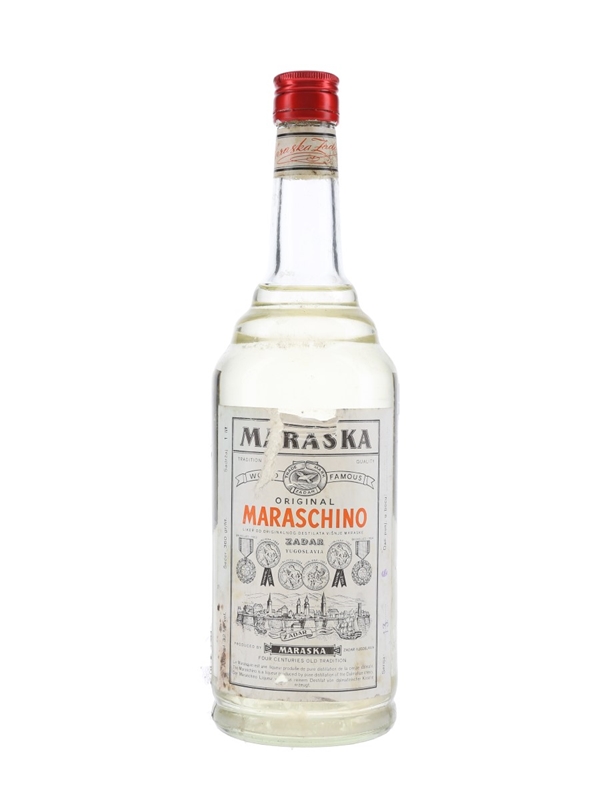 A litre bottle of Maraska Maraschino Original liqueur produced in Zadar, Croatia.