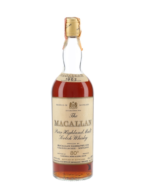 A bottle of The Macallan 1962 Pure Highland Malt Scotch Whisky, distilled in 1962 and bottled by Campbell, Hope & King. This was bottled for the Italian market and imported by Rinaldi, we estimate in the 1970s.