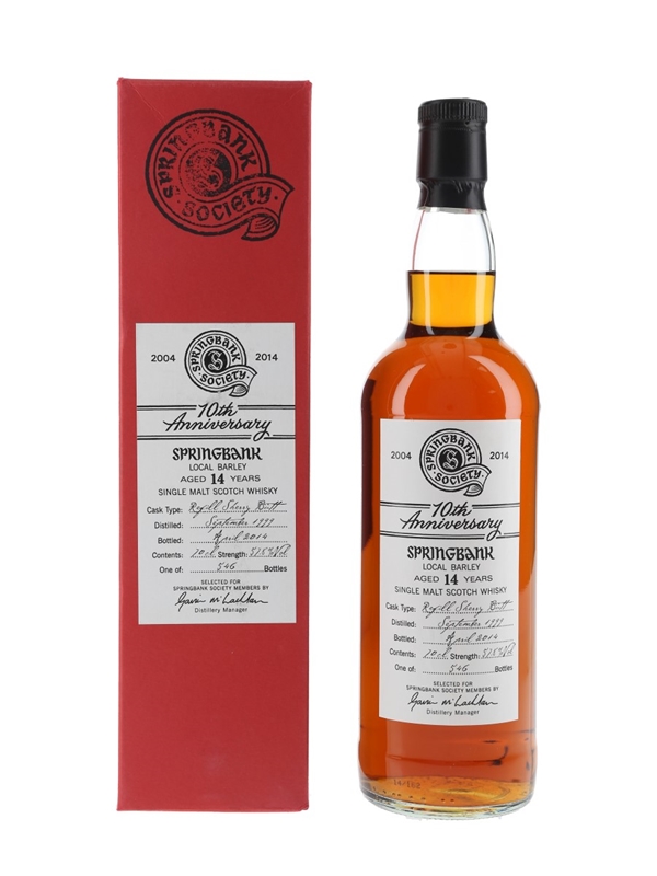 A bottle of Springbank 14 Year Old Single Malt Scotch Whisky. This was distilled in September 1999, matured in a refill sherry butt and bottled at 57.8% ABV in April 2014. This was selected and bottled to celebrate the 10th anniversary of the Springbank Society.