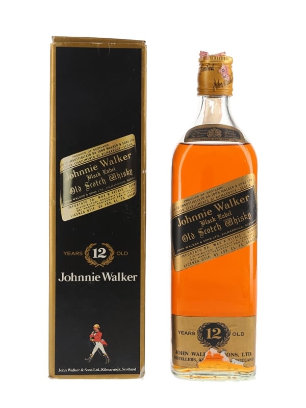 A bottle of Johnnie Walker Black Label 12 Year Old Scotch Whisky. This was bottled for the Italian market and imported by Wax & Vitale, we estimate in the 1970s.