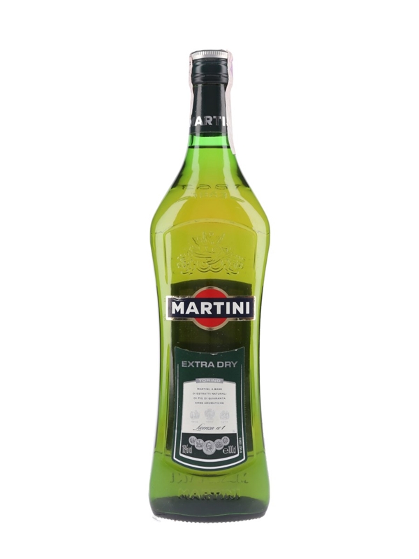 A bottle of Martini Extra Dry Vermouth produced by Martini & Rossi.