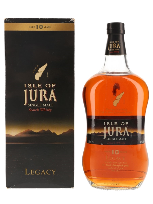 A litre bottle of Jura Legacy 10 Year Old Single Malt Scotch Whisky from the Isle of Jura.