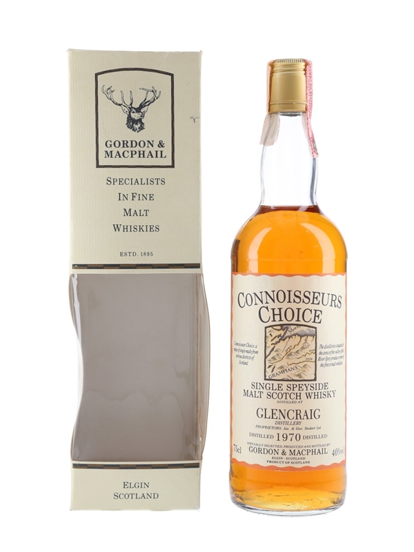 A bottle of Glencraig Single Malt Scotch whisky. This was distilled in 1970 and bottled by Gordon & MacPhail as part of the Connoisseurs Choice series. The bottling code indicates this was bottled in 1987.