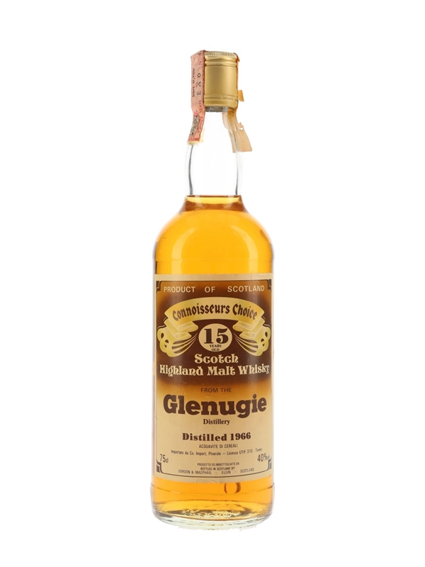 A bottle of Glenugie 15 Year Old Scotch Highland Malt Whisky. This was distilled in 1966, matured for 15 years and bottled by Gordon & MacPhail as part of the Connoisseurs Choice series. This was bottled for the Italian market and imported by Co. Import, Pinerolo, we estimate in the early 1980s.