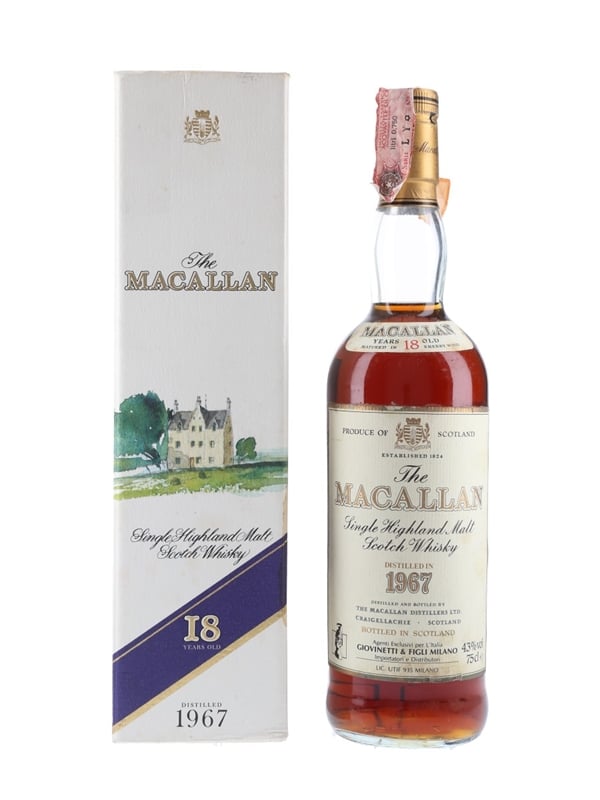 A bottle of The Macallan 18 Year Old Single Highland Malt Scotch Whisky. This was distilled in 1967, matured in sherry casks and bottled in the mid 1980s for Italian importer Giovinetti & Figli.