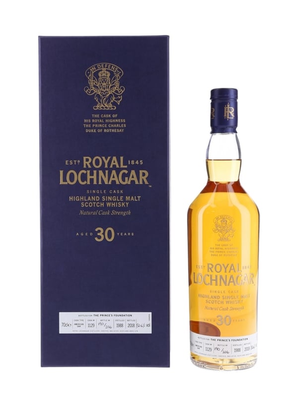 Bottle number 190 of 206 of the Royal Lochnagar 30 Year Old Single Malt Scotch Whisky from the 1988 cask of HRH The Prince Charles, Duke of Rothesay.