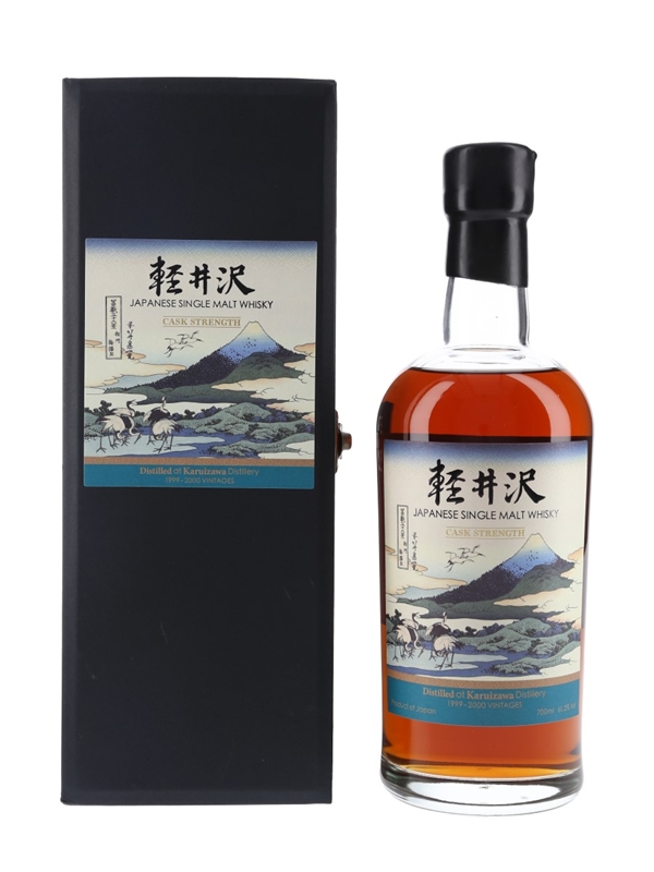 A bottle of Karuizawa from the 36 Views of Mount Fuji series. Each bottle in this series was produced from Karuizawa's final two vintages, 1999 and 2000, and are bottled at cask strength. The labels feature artwork by Japanese ukiyo-e artist Hokusai, depicting Mount Fuji from different aspects.