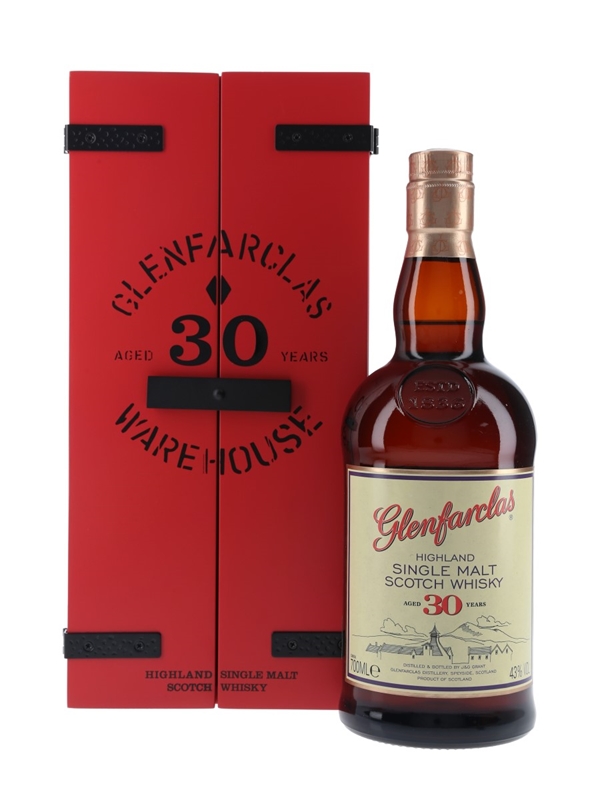 A bottle of Glenfarclas 30 Year Old Highland Single Malt Scotch Whisky.