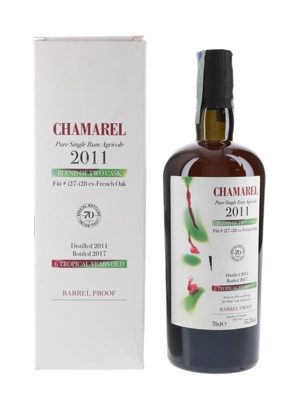 A bottle of Chamarel rum from Mauritius, bottled in 2017 to celebrate the 70th anniversary of Italian bottler Velier. This was distilled in 2011 and matured for six years in two French oak casks. The packaging was designed by Singaporean artist Warren Khong.