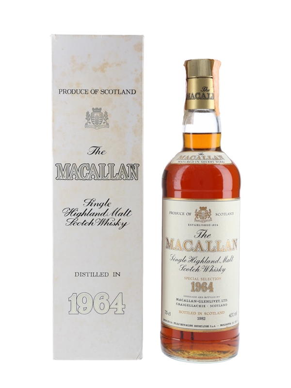 A bottle of The Macallan 1964 Single Malt Scotch Whisky. This was distilled in 1964, matured in sherry wood, bottled in 1982 for the Italian market and imported by Rinaldi.