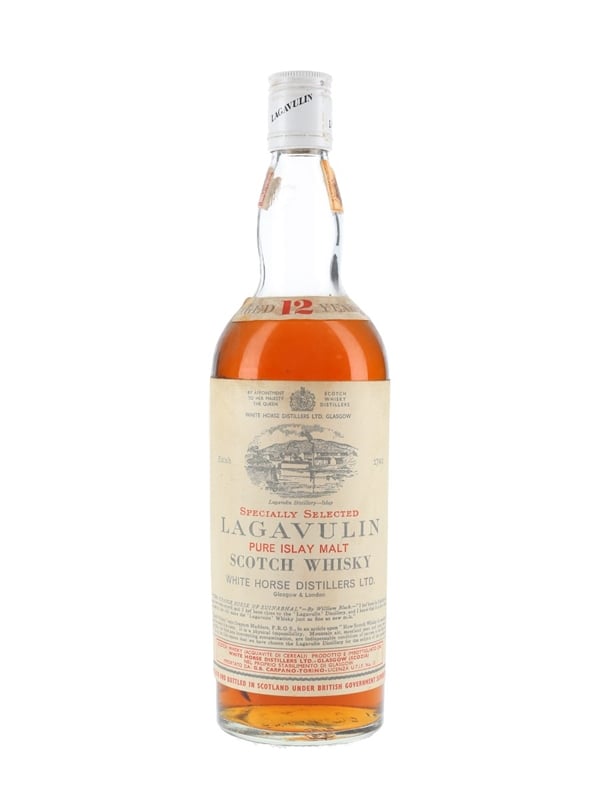 A bottle of Lagavulin 12 Year Old Specially Selected Pure Islay Malt Scotch Whisky, bottled by White Horse Distillers. Lagavulin shared the same ownership as the White Horse blend, of which Lagavulin is a major constituent part. This was bottled for the Italian market and imported by Carpano, we estimate in the 1970s.