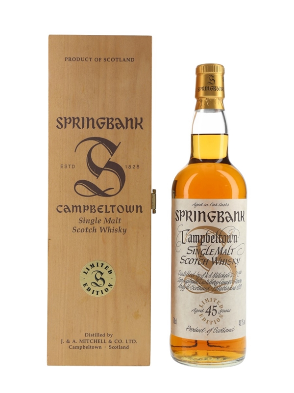 A limited edition bottle of Springbank 45 Year Old Campbeltown Single Malt Scotch Whisky. This was bottled at natural cask strength and released in September 2000 as the fifth expression in the Millennium series.