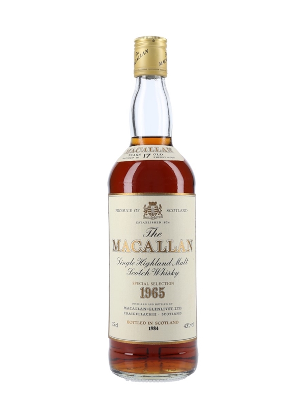 A bottle of The Macallan 17 Year OId Special Selection Single Highland Malt Scotch Whisky. This was distilled in 1965, matured in sherry casks and bottled in 1984.