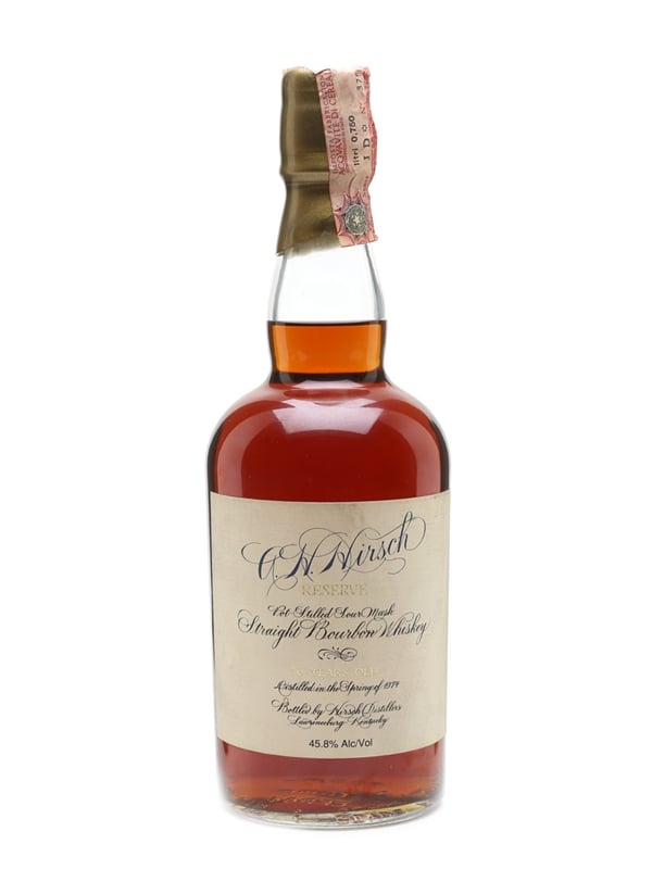 A bottle of 1974 A H Hirsch. This 16 -year-old pot-still sour-mash bourbon whiskey was imported into Italy by Velier. The distillery marked this as an export release by giving the bottle a gold wax seal, while the domestic release was sealed with black wax.