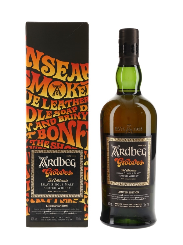 A bottle of Ardbeg Grooves The Ultimate Islay Single Malt Scotch Whisky, bottled to celebrate the Ardbeg Day in 2018.