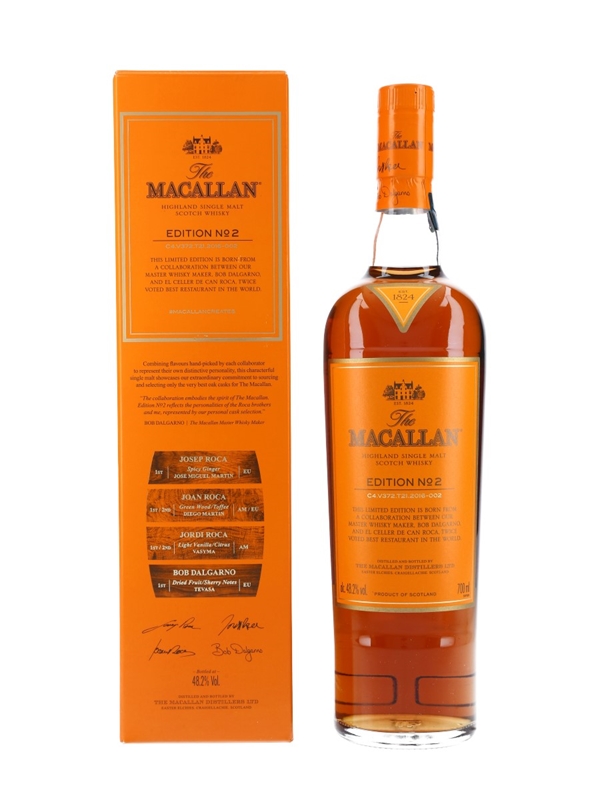 A bottle of The Macallan Edition No.2 Highland Single Malt Scotch Whisky. This is a limited edition matured in four distinct cask types selected by master blender Bob Delgarno and Spanish chefs Joan, Josep and Jordi Roca from El Celler de Can Roca. The restaurant was twice voted best restaurant in the world.